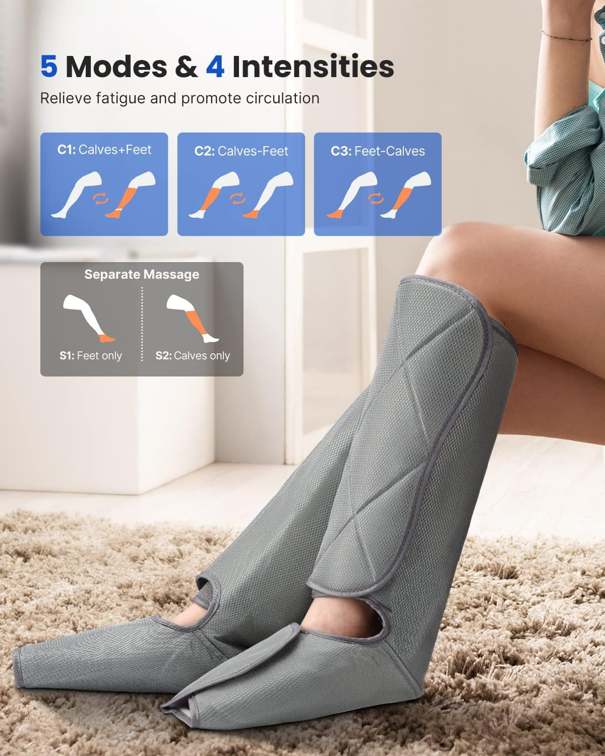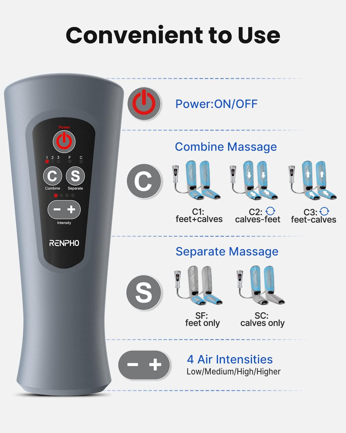 Aparat de masaj gambe si picioare cu compresie aer Renpho ALM071H, 5 moduri masaj, 3 intensitati, Incalzire, controler inclus, pentru circulatie si relaxare musculara este un dispozitiv pentru îngrijire personală potrivit pentru îngrijire personală și styling. În descriere se remarcă elemente precum dc 12 v 2 a putere, 24 w nota, care susțin o utilizare mai practică.